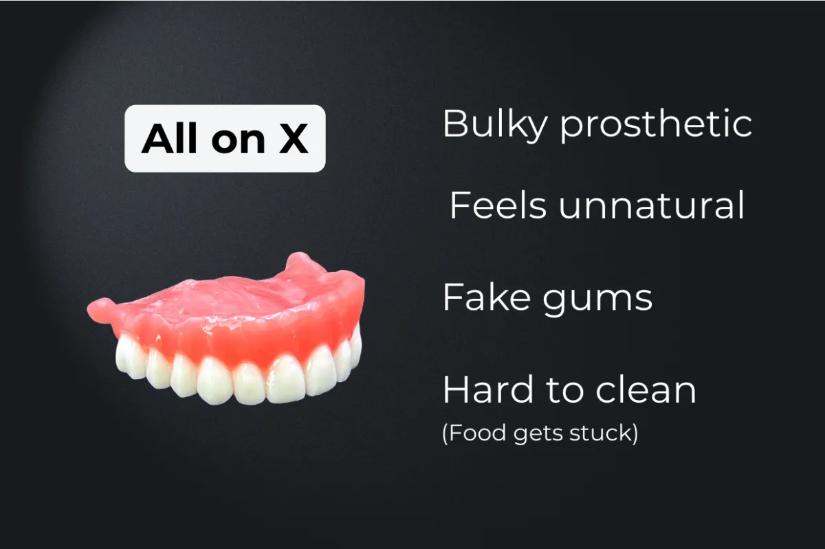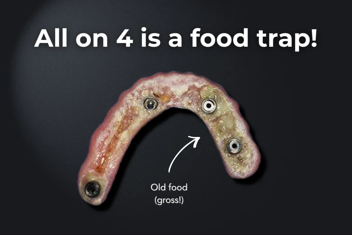 Food will buildup under the prosthetic which can be difficult to clean at home. Patients should have their All-on-4 removed annually for a professional cleaning.
